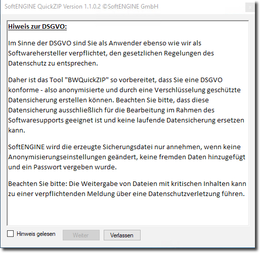 BWQuickZIP ersetzt keine vollständige Datensicherung! Es werden nur die für die Prüfung durch den Support relevanten Daten gesichert. |