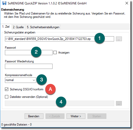 << Hier KLicken um eine Inhaltsübersicht anzuzeigen >> Navigation: Datenbankassistent > Datenarchivierung > BWQuickZip > Die Kateikarte "Ziel" |