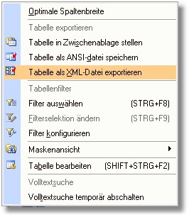 2. Wählen Sie den Menüpunkt "Tabelle als XML-Datei exportieren“.