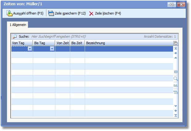 3. In den Spalten VON/BIS TAG und VON/BIS ZEIT können Sie die verschiedenen Zeiten Ihres Ansprechpartners eintragen bzw. ändern. z.B. Öffnungszeiten, Mittagspause, Telefonzeiten usw. Mit [F5] öffnet sich in den Spalten "Von/Bis Tag" eine Auswahltabelle.
