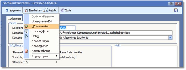 << Hier KLicken um eine Inhaltsübersicht anzuzeigen >> Navigation: Finanzbuchhaltung > Stammdaten > Sachkonten > Die Karteikarte "Sachkonten" > Sachkonten bearbeiten > Sachkontenstamm - Erfassen/Ändern > USt-Kennziffern für ein einzelnes Konto bearbeiten |