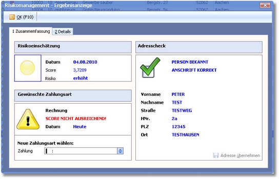 In diesem Beispiel ist die Zahlungsart "Auf Rechnung" nicht möglich, da der Mindestboniscore nicht ausreicht (erhöhtes Risiko).