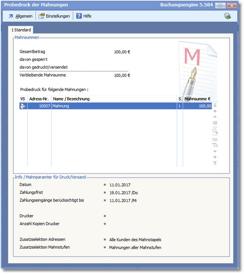 Mahnungen eines Stapels können Sie über den Menüeintrag "Tools > Probedruck der Mahnungen" zur Probe ausdrucken.