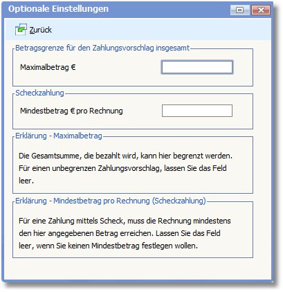 Hier können Sie optionale Einstellungen für den Zahlungsvorschlag vornehmen, einen Höchstbetrag für den Zahlungsvorschlag sowie einen Mindestbetrag für die Scheckzahlung hinterlegen.
