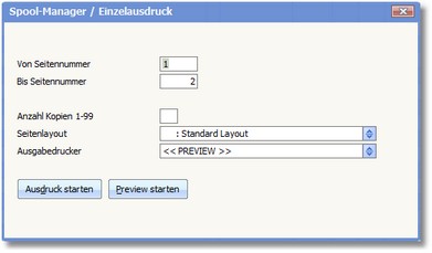 Spooldateien oder Druckaufträge können auf dem Drucker ausgegeben werden. Über den Button <Spooldatei ausdrucken> wird ein Dialogfenster zum Ausdruck einzelner oder aller markierten Spooldateien geöffnet.