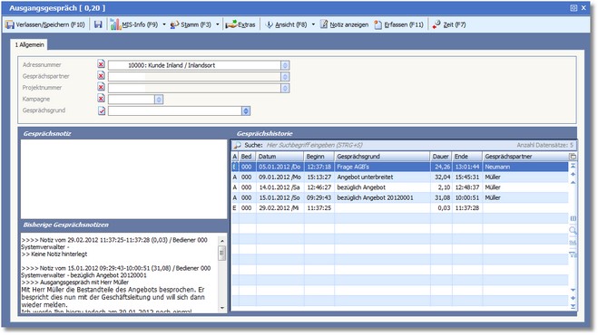In diesem Informationsfenster erhalten Sie Auskunft über die bisher mit dem Kunden, Interessenten oder Lieferanten geführten Gespräche.