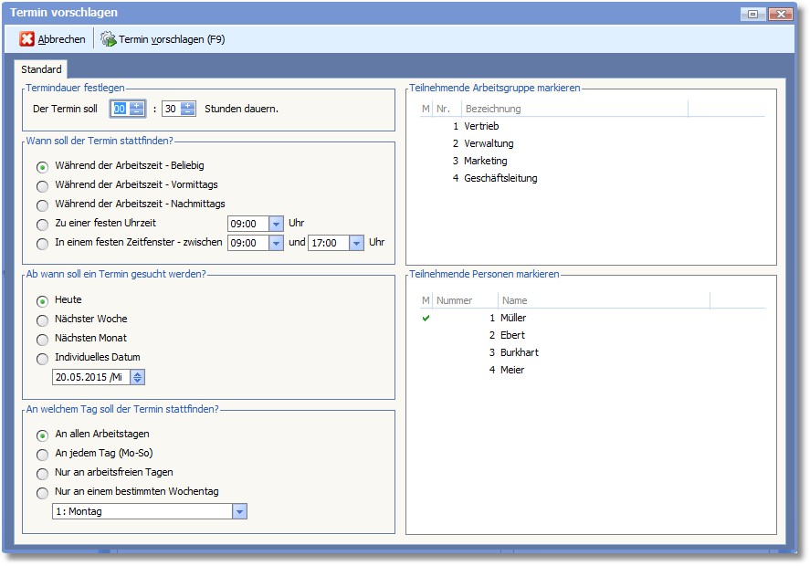 Hier kann für eine Arbeitsgruppe, einen Mitarbeiter oder für einen Pool von auszuwählenden Personen ein Terminvorschlag erstellt werden.