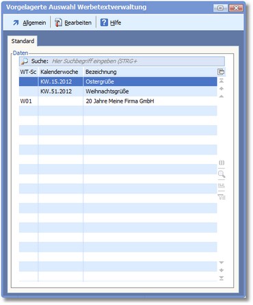Das Programm öffnet die vorgelagerte Auswahltabelle der Werbetexte. Hier werden alle bereits angelegten Werbetexte angezeigt.