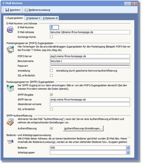 Eine mehrfache Bedienerzuweisung mit ";" getrennt ist hier möglich, wird jedoch nicht empfohlen, da pro Posteingang eine physikalisch getrennte Mail abgelegt wird.