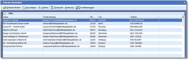 Im privaten Adressbuch werden folgende Spalten angezeigt: