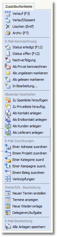 Die Zusatzbuttonleiste beinhaltet das gesamte Mailkontextmenü und die untere Buttonleiste der Mailtabelle.