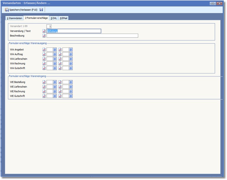 Nachfolgend die einzelnen Felder der Karteikarte "Versandarten - Formularvorschläge":
