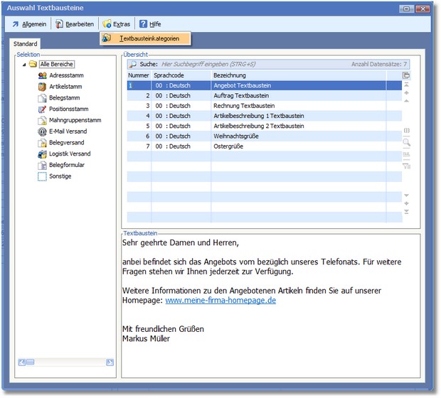 Textbausteinkategorien dienen der Gruppierung von Textbausteinen und können über die Textbausteinverwaltung aufgerufen werden.