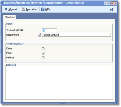 Navigation:  Warenwirtschaft > Stammdaten > Basisdaten > Versandart > Versandmittel >