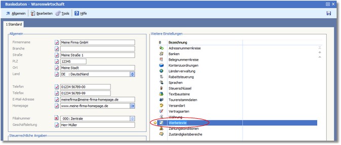 << Hier KLicken um eine Inhaltsübersicht anzuzeigen >> Navigation: Warenwirtschaft > Stammdaten > Basisdaten > Werbetexte |