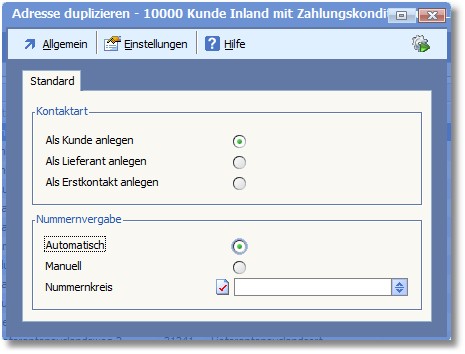 Bei der Duplikation dient eine ausgewählte Adresse als Vorlage; sie wird "kopiert", mit einer neuen Adressnummer versehen und als neue Adresse gespeichert. Dabei können die in den Stammdaten der Originaladresse hinterlegten Parameter (z.B. Fibu-Einstellungen, Konditionen etc.) mit übernommen werden.
