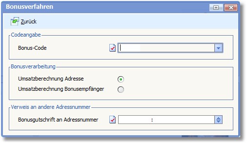 Eingetragen wird der Bonuscode. Der Bonuscode bestimmt die Konditionen der Bonusermittlung für diese Adresse.