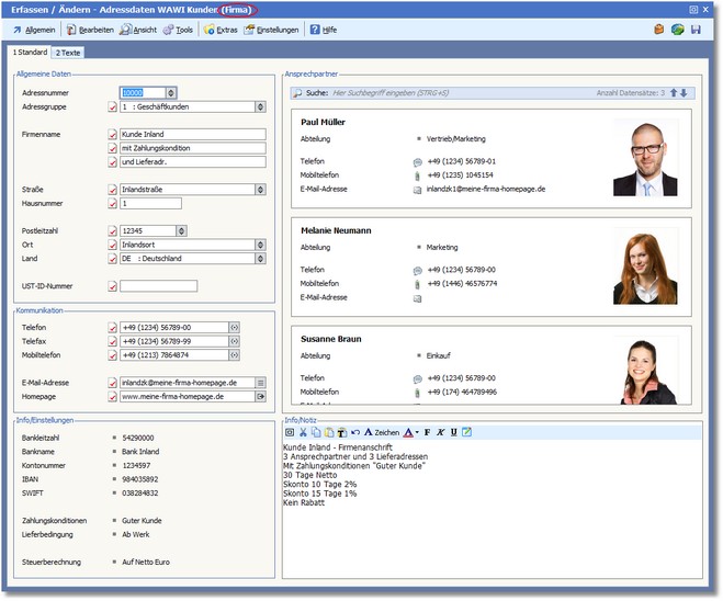 Hier werden allgemeine Kundendaten und Ansprechpartner verwaltet sowie spezielle Einstellungen (z.B. Lieferadressen, Zahlungskonditionen, Skonto, Rabatt, Vertreter etc.) für den Kunden festgelegt.
