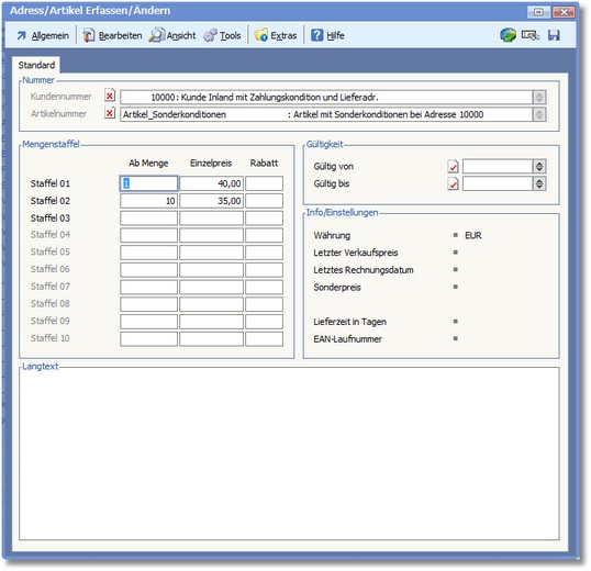 6. Erfassen Sie die Daten in den vorgesehenen Feldern und speichern Sie die neue Adress/Artikel-Kondition mit der Funktionstaste [F10].