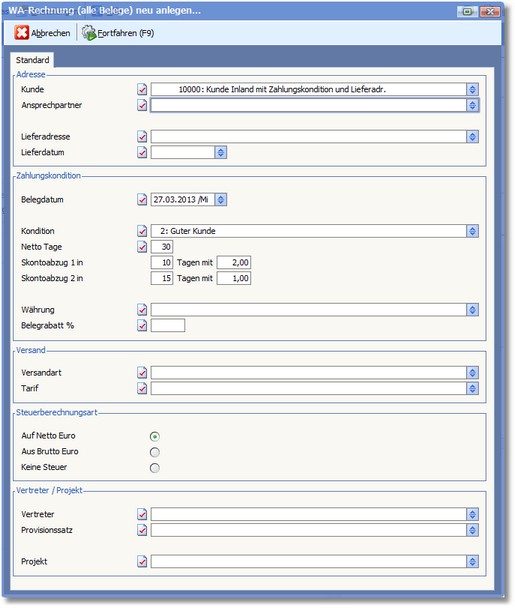 Die Steuerberechnung ist von besonderer Bedeutung und sollte schon im Adressstamm entsprechend korrekt hinterlegt sein. Vorgeschlagen wird auch hier die Kennziffer, die beim Kunden bzw. Lieferanten hinterlegt ist. Ein nachträgliches Ändern der Steuerberechnungsart ist nicht möglich.
