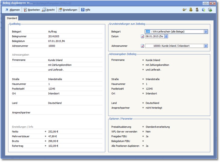 3. Überprüfen Sie die hier angezeigten Einstellungen und nehmen Sie bei Bedarf noch Änderungen (z.B. an Belegart oder Adressnummer) vor. 4. Klicken Sie auf den Menüeintrag "Bearbeiten > Duplikationsart". 5. Aktivieren Sie hier den Radiobutton "Nur bestimmte Positionen duplizieren" und klicken Sie auf <Zurück>. 6. Starten Sie die Duplikation anschließend mit [F9].