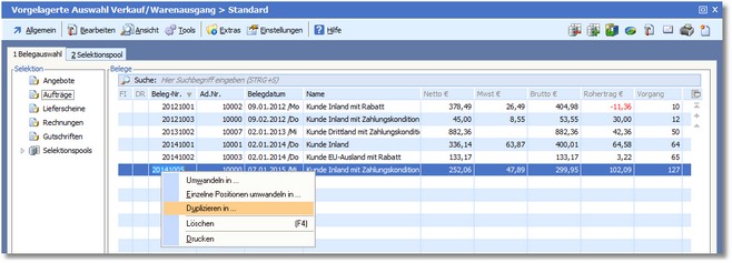 1. Klicken Sie mit der rechten Maustaste in der Belegübersicht Wareneingang/Warenausgang auf den zu duplizierenden Beleg.