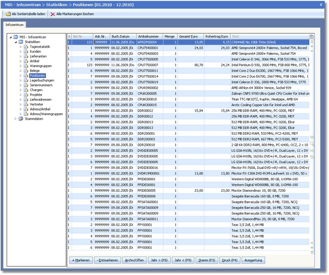 Nach Auswahl des MIS-Bereiches öffnet sich zunächst eine vorgelagerte Auswahltabelle, in der alle Belegpositionen tabellarisch angezeigt werden. Über die Baumauswahl kann in die einzelnen Belegarten verzweigt werden. Innerhalb dieser Auswahltabelle sind die beschriebenen Such- und Sortierfunktionen aktiv.