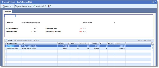 In der Bestellvorschlagstabelle werden alle zur Bestellung vorgeschlagenen Artikel angezeigt. Die vorgeschlagene Bestellmenge richtet sich dabei nach den Bestellvorgaben des im Artikelstamm hinterlegten Lieferanten.