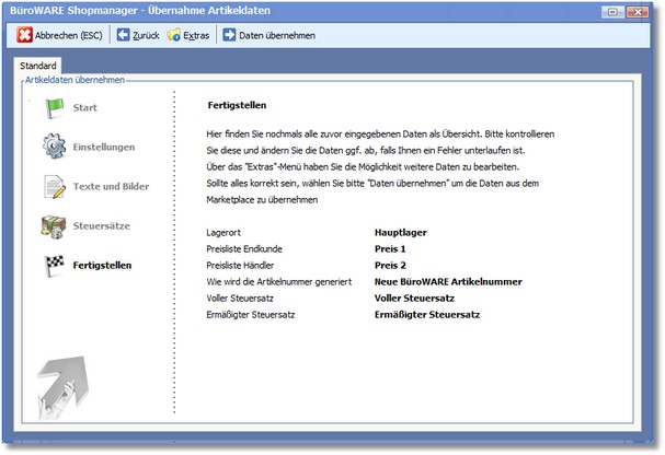 Es wird nun eine Zusammenfassung der Einstellungen für die Datenübernahme angezeigt.