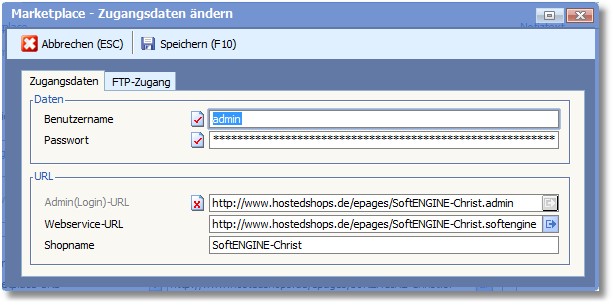 In dieser Optionsmaske werden die für den Marketplace bei der Einrichtung hinterlegten Zugangsdaten angezeigt und können in den jeweiligen Feldern direkt bearbeitet werden.