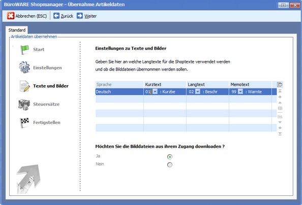 3. Legen Sie hier nun die gewünschten Einstellungen für Texte und Bilder fest und klicken Sie auf <Weiter>.