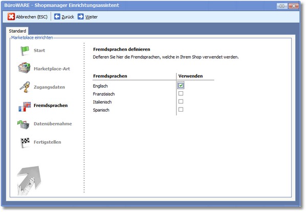 5. Legen Sie hier durch Aktivierung der entsprechenden Optionen die Fremdsprachen fest, mit denen Sie in Ihrem Shop arbeiten und klicken Sie auf <Weiter>.
