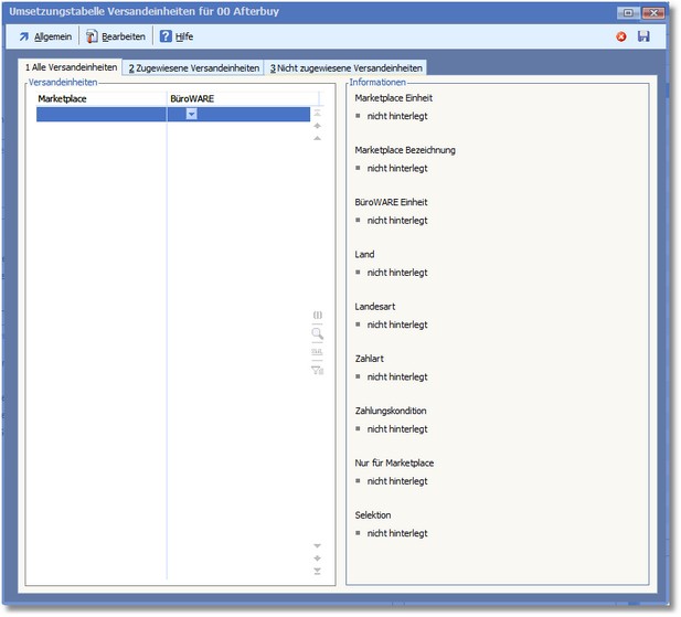 << Hier KLicken um eine Inhaltsübersicht anzuzeigen >> Navigation: Warenwirtschaft > Extras > Shopmanager > Marketplaces > Afterbuy > Marketplace verwalten > Umsetzungstabellen > Versandeinheiten |