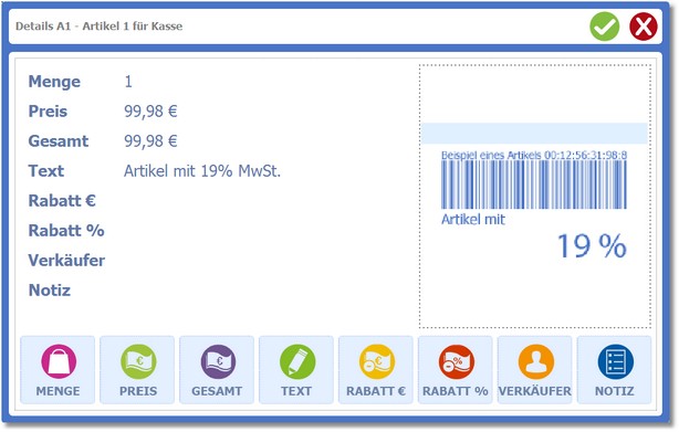 Hier können Sie Menge, Preis und Rabatt für den aktuellen Artikel festlegen.
