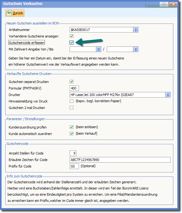 In der Einstellungsmaske aktivieren Sie die manuelle Eingabe des Gutscheincodes.