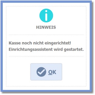 Beim ersten Start der Kasse (Im Arbeitsplatz auf Kassieren klicken) oder beim ersten Aufruf der Basisdaten (Basisdaten Kasse) erscheint ein Hinweis "Kasse noch nicht eingerichtet! Einrichtungsassistent wird gestartet".