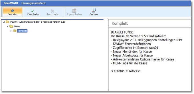 Bei Update einer älteren BüroWARE Installation mit der Workflow Kasse (oder älter) muss die Kasse über den Migrationsassistenten migriert werden.