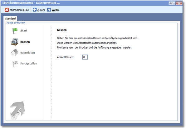 Es wird allerdings erkannt, dass schon Kassenstammdaten vorhanden sind und der Assistent setzt automatisch das Feld ANZAHL KASSEN auf 0.