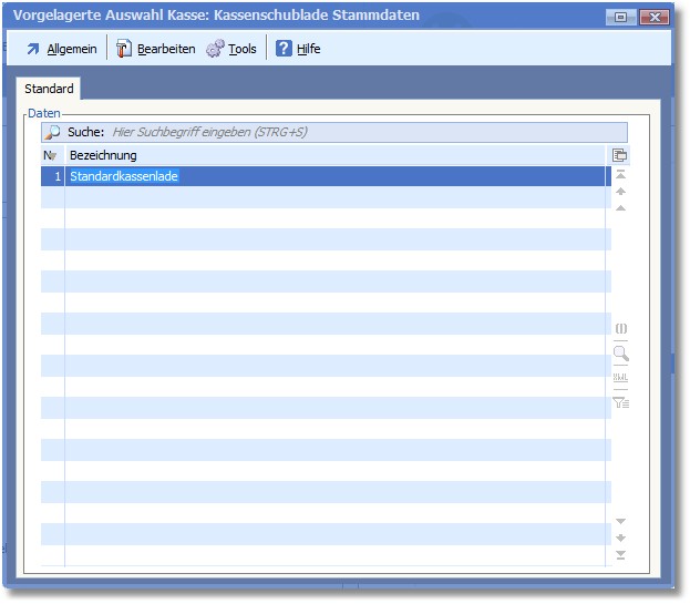 Die Kassenschublade wird über eine eigene Datenbank angesteuert. In diesem Dialog können verschiedene Kassenladen angelegt werden und in den Kassenstammdaten wird dann die entsprechende Kassenlade zur Kasse hinterlegt.