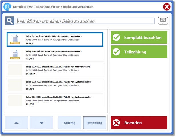 Die Zahlung wird gespeichert und die Rechnung aus der Auftragsliste entfernt.