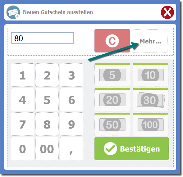 Klicken Sie in der Maske "Neuer Gutschein" auf die Schaltfläche "Mehr".