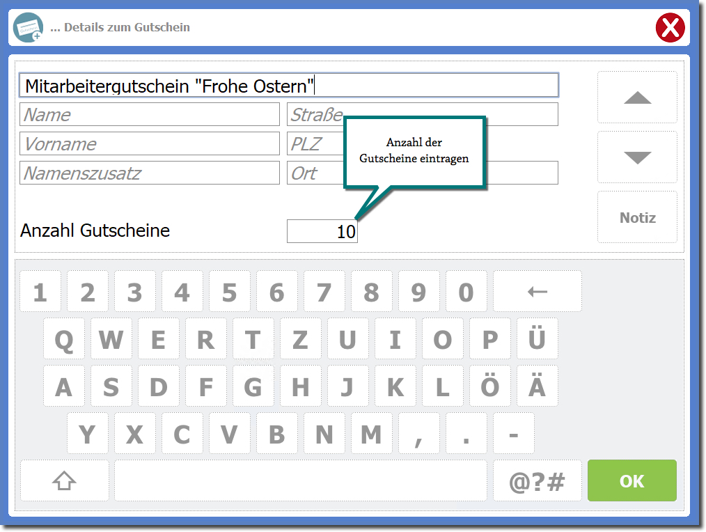 Mit dem Button "OK" werden die Gutscheine angelegt und in den BON übernommen.