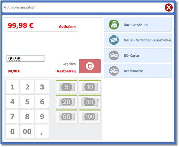 3. Speichern Sie die Positionszeile mit [RETURN] oder [F12]. 4. Wiederholen Sie ggf. die Schritte 2 und 3 zur Erfassung weiterer Artikel. 5. Betätigen Sie anschließend die Schaltfläche <Zahlen>. 6. Wählen Sie durch Klick auf die entsprechende Schaltfläche, ob Sie das Guthaben bar auszahlen oder einen neuen Gutschein erstellen möchten.