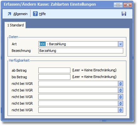 << Hier KLicken um eine Inhaltsübersicht anzuzeigen >> Navigation: Kassensystem > Technische Informationen (Systeminformation) > Vorbereitende Arbeiten > Grundeinrichtung der Kasse > Detaileinrichtung der Kasse (Basisdaten) > Weitere Einstellungen > Zahlarten Einstellungen > Zahlarten erfassen/ändern |