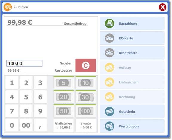 Wenn Sie den erhaltenen Betrag zunächst in das Feld eintragen und anschließend die Schaltfläche <Barzahlung> betätigen, wird der Dialog "Zahlvorgang abschließen" geöffnet.
