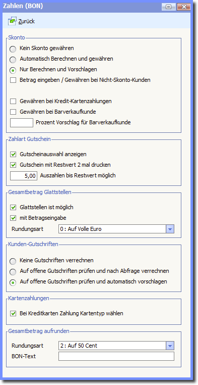 Hier können Einstellungen vorgenommen werden, die den Zahlungsvorgang beim Abschluss eines BONs beeinflussen.
