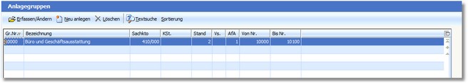 << Hier KLicken um eine Inhaltsübersicht anzuzeigen >> Navigation: Anlagenbuchhaltung > Stammdaten > Anlagegruppen |