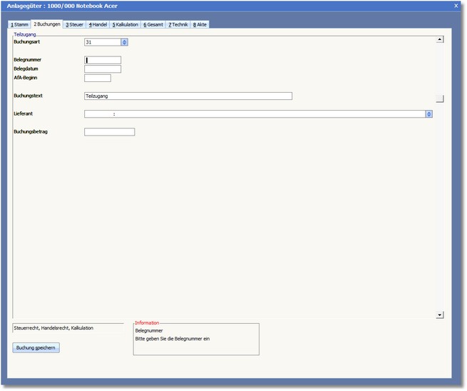 << Hier KLicken um eine Inhaltsübersicht anzuzeigen >> Navigation: Anlagenbuchhaltung > Buchungen > Das Buchen von Anlagen > Buchen von Teilzugängen |