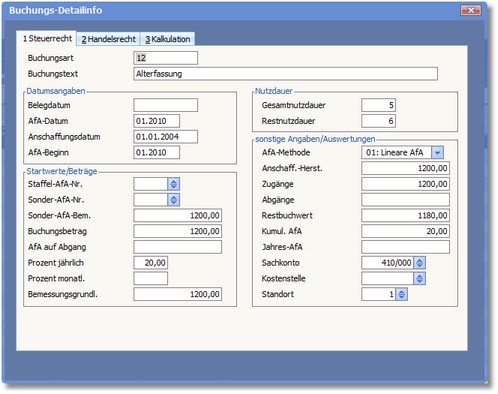 Der Infodialog ist in die Bereiche „Steuerrecht", „Handelsrecht" und „Kalkulation" durch Register unterteilt. Diese karteikartenähnliche Darstellungsweise ermöglicht es, die Buchungsdaten der ausgewählten Erfassungszeile in jedem dieser Bereiche zu beauskunften. Die Felder der Karteikarten sind dabei identisch. Lediglich die darin gespeicherten Informationen können sich voneinander unterscheiden, wenn für die einzelnen Bereiche abweichende Abschreibungen gebucht wurden.