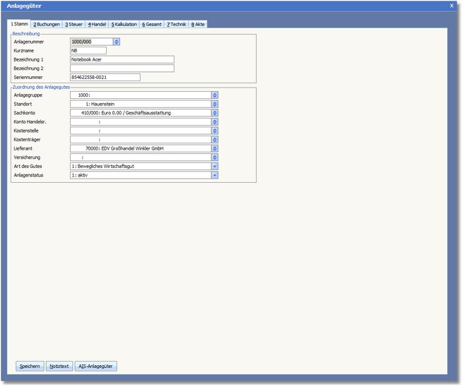 Der Eingabedialog präsentiert sich in karteikartenähnlicher Form. Haben Sie die Neuanlage eines Wirtschaftsgutes gewählt, so ist vorerst nur die erste Karteikarte mit der Registerbeschriftung „Stamm" aktiv.
